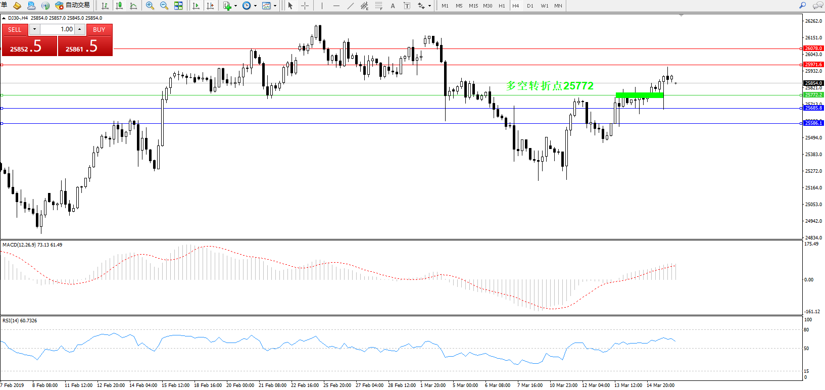 道琼斯指数DJ30—— 4小时K线图显示:
