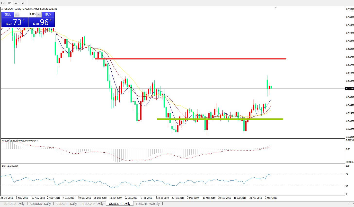 交易策略6.6990之上,看涨,目标价位为6.7845,然后为6.8200