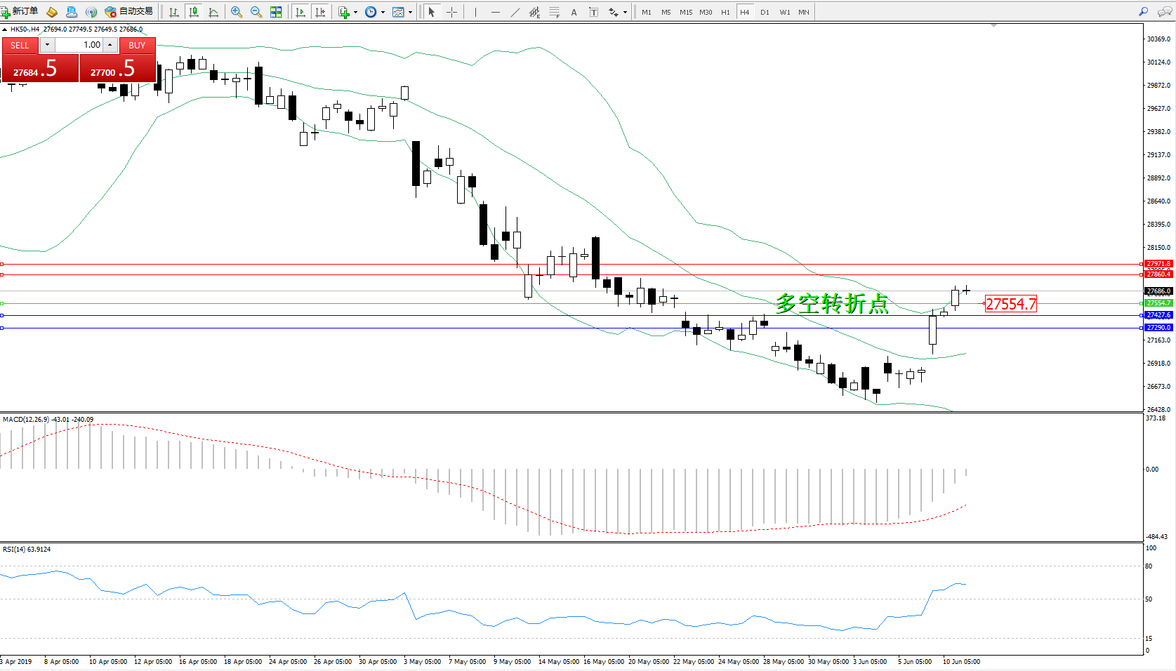恒指HK50 ——4小时K线图显示: