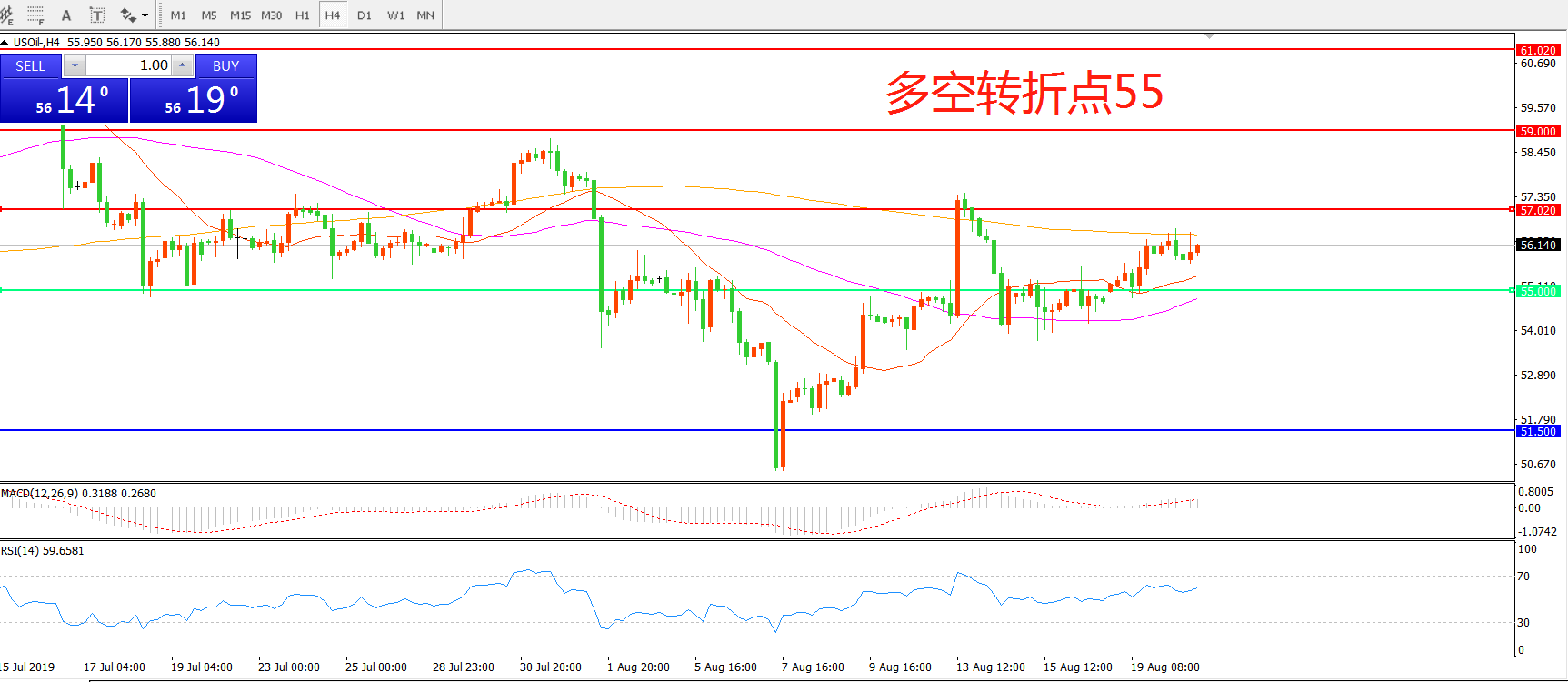 北京时间8月21日凌晨,美国石油协会(API)公布的数据显示,美国截至8月16日当周API原油库存减少345万桶,降幅超过预期的188.5万桶,利好油价,加上市场乐观地认为全球贸易紧张局势将会缓和,且憧憬主要经济体将采取刺激措施以防止潜在的经济放缓,油价小幅反弹,最终收报56.13美元/桶。晚间22:30将公布EIA库存数据,务必重点关注。