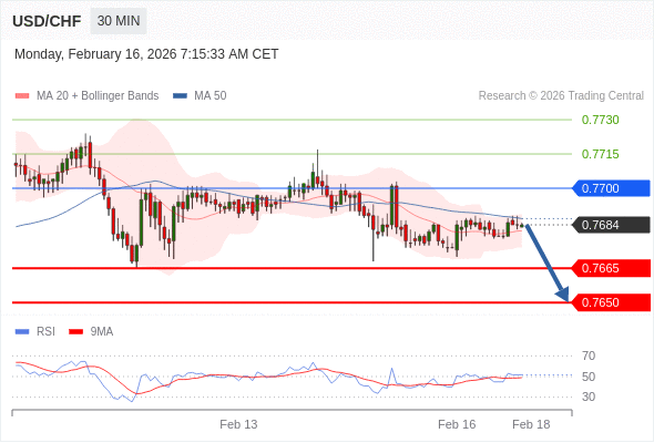 在 0.7700 之下,看跌,目标价位为 0.7665 ,然后为 0.7650 。