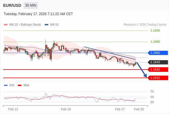 交易策略: 在 1.1860 之下,看跌,目标价位为 1.1830 ,然后为 1.1815 。