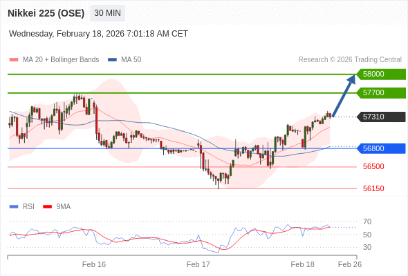 在 56800 之上,看涨,目标价位为 57700 ,然后为 58000 。