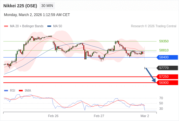 在 58400 之下,看跌,目标价位为 57250 ,然后为 56900 。