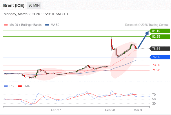 布伦特原油 (ICE) (K6) 当日内: 在76.00之上,看涨。