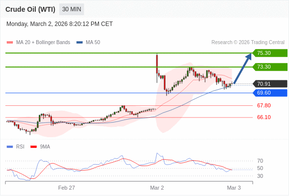 在 69.60 之上,看涨,目标价位为 73.30 ,然后为 75.30 。