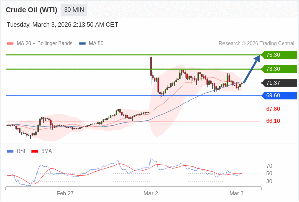 在 69.60 之上,看涨,目标价位为 73.30 ,然后为 75.30 。