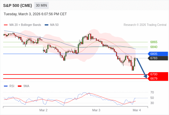美国标普500指数期货 (H6) 当日内: 目标位为6700。