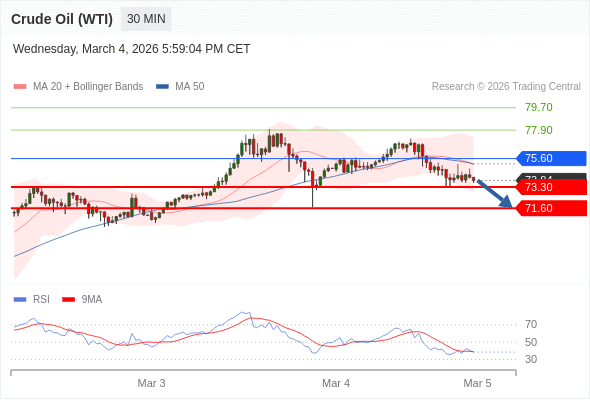 在 75.60 之下,看跌,目标价位为 73.30 ,然后为 71.60 。