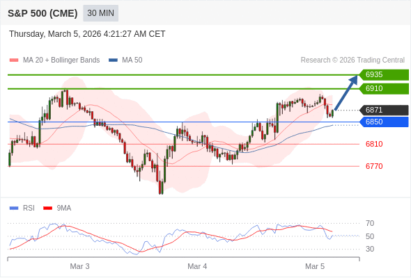 美国标普500指数期货 (H6) 当日内: 在6850之上,看涨。