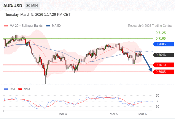 在 0.7085 之下,看跌,目标价位为 0.7010 ,然后为 0.6985 。