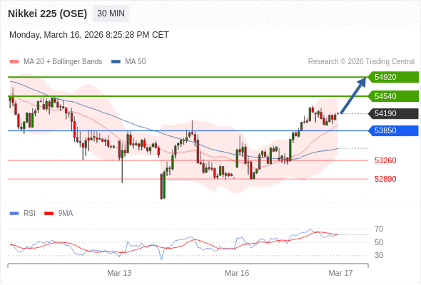 在 53850 之上,看涨,目标价位为 54540 ,然后为 54920 。