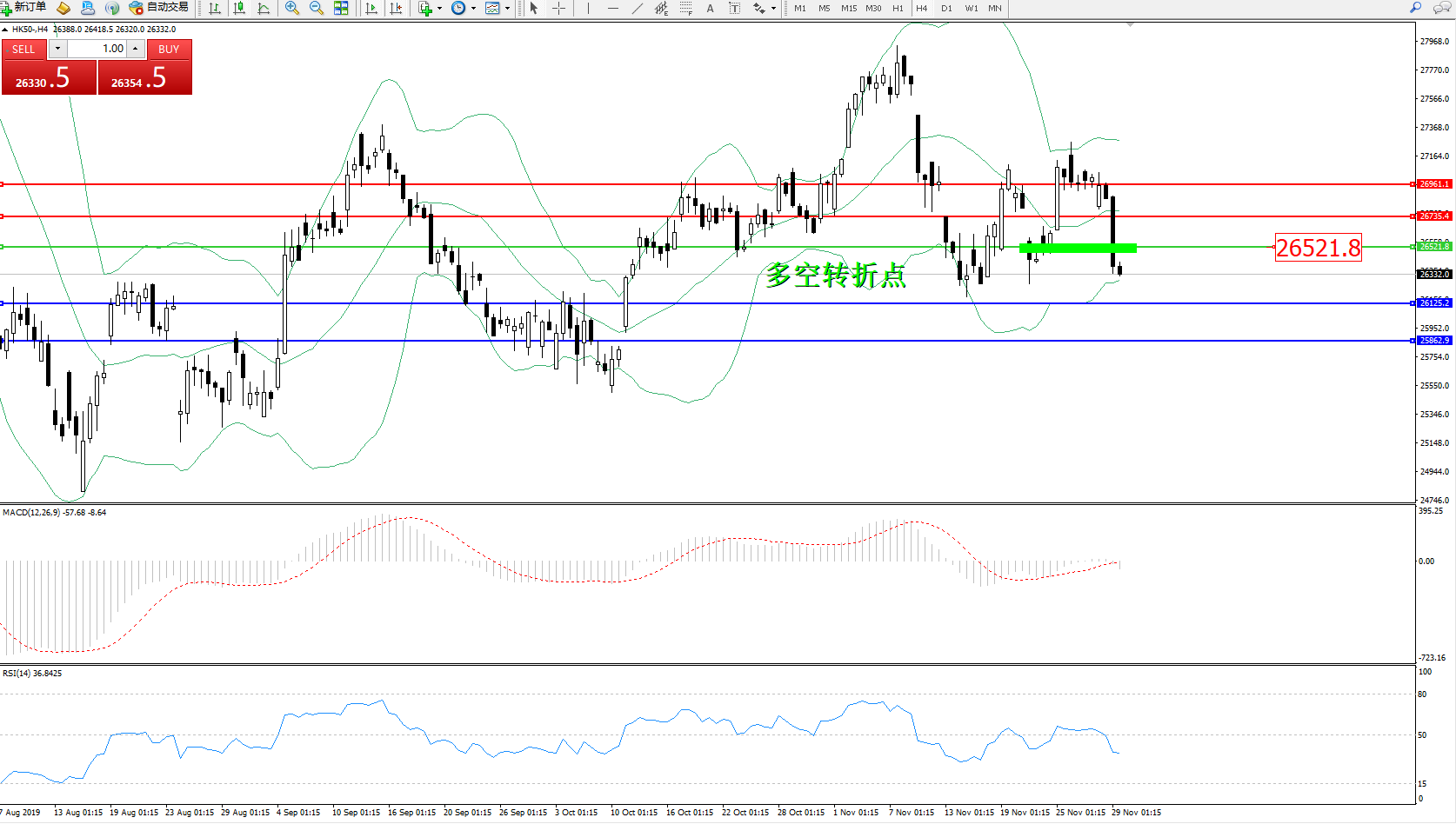 香港恒生指数1129日(周五)收盘下跌547.24点,跌幅2.03%,报26346.49点;港股低开188点后再延续跌势,并扩大跌幅。由于美国股市为感恩节假期休市,A股回落。在欠缺方向的情况下,股市出现大幅抛售,恒指越跌越深,低见26327,最多跌566点。由于仍见有向下的趋势,此刻不宜追入,极有机会下试26000关口。恒指开始走弱,在震荡市做交易确实性价比不高,太浪费精力而且风险收益比不高。留意美国零售销售行情,中港股市继续拉锯。