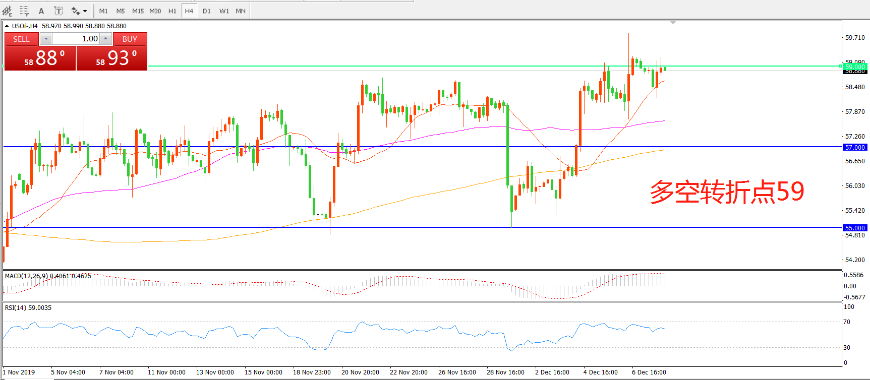 4小时图看,油价阳线连续拉升,再次触碰整理区间上沿,59附近成为短期多空分水岭,均线系统走平,MACD红柱增加,RSI指标走平,日内延续上行概率较大。