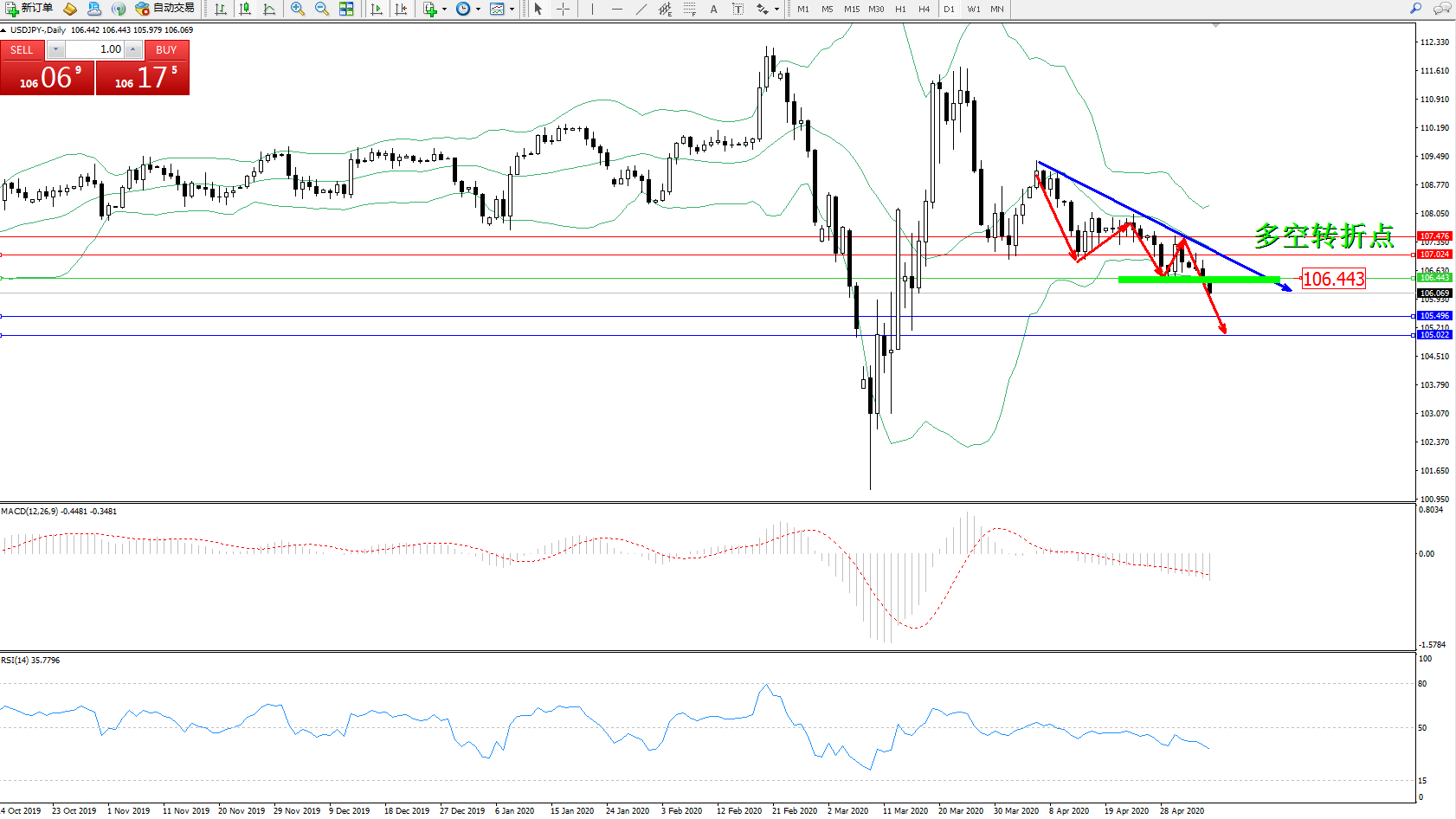 交易策略:106.443下方看跌,目标105.496、105.022