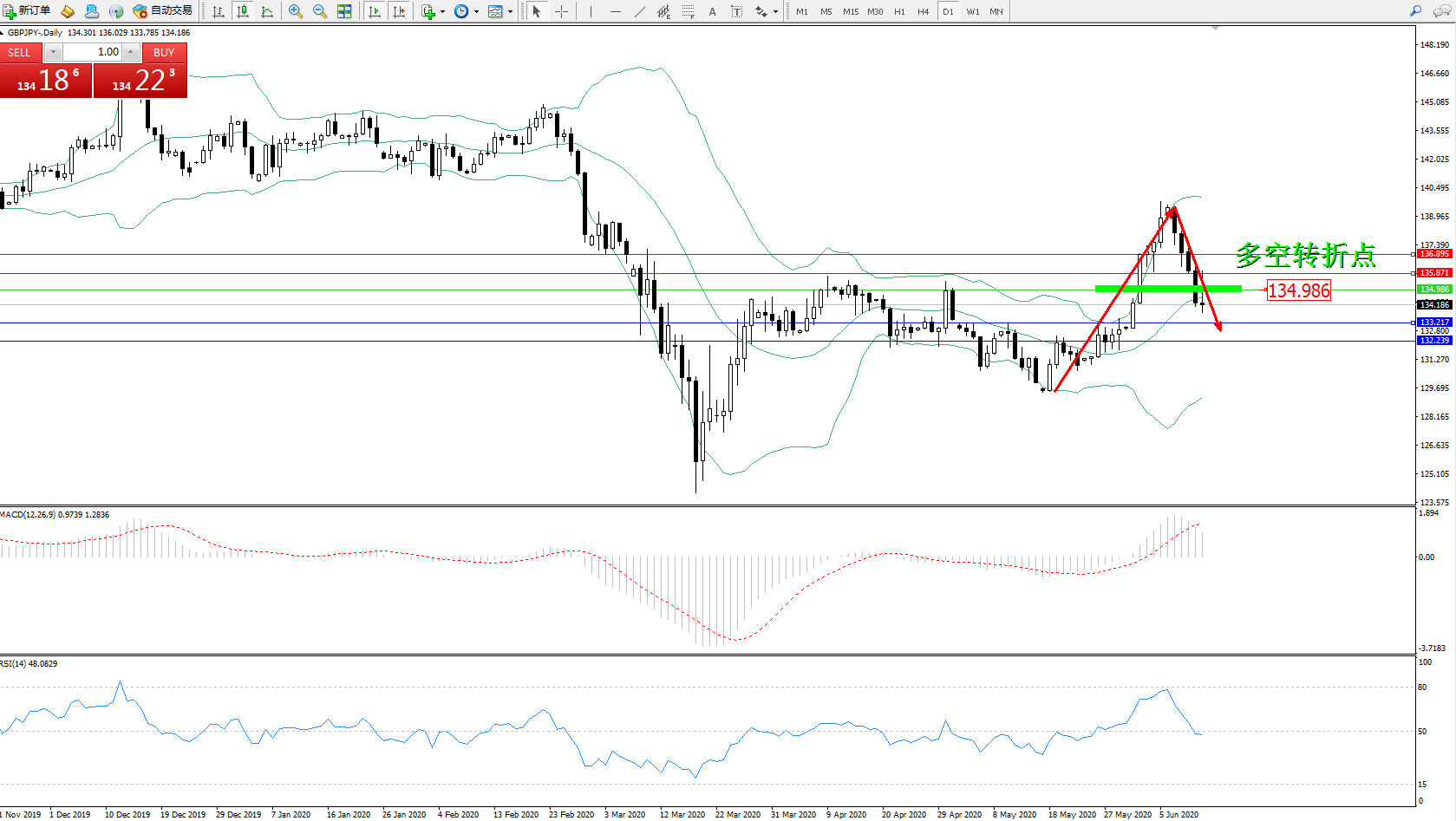 交易策略:134.986下方看跌,目标133.217、132.239