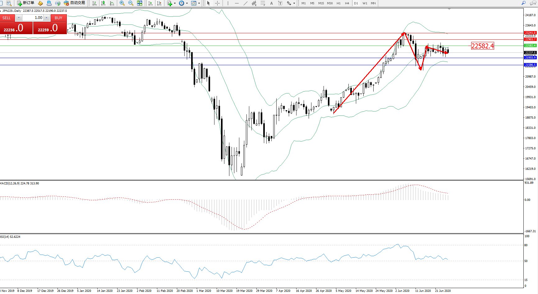 日经指数JPN225——日K线图显示: