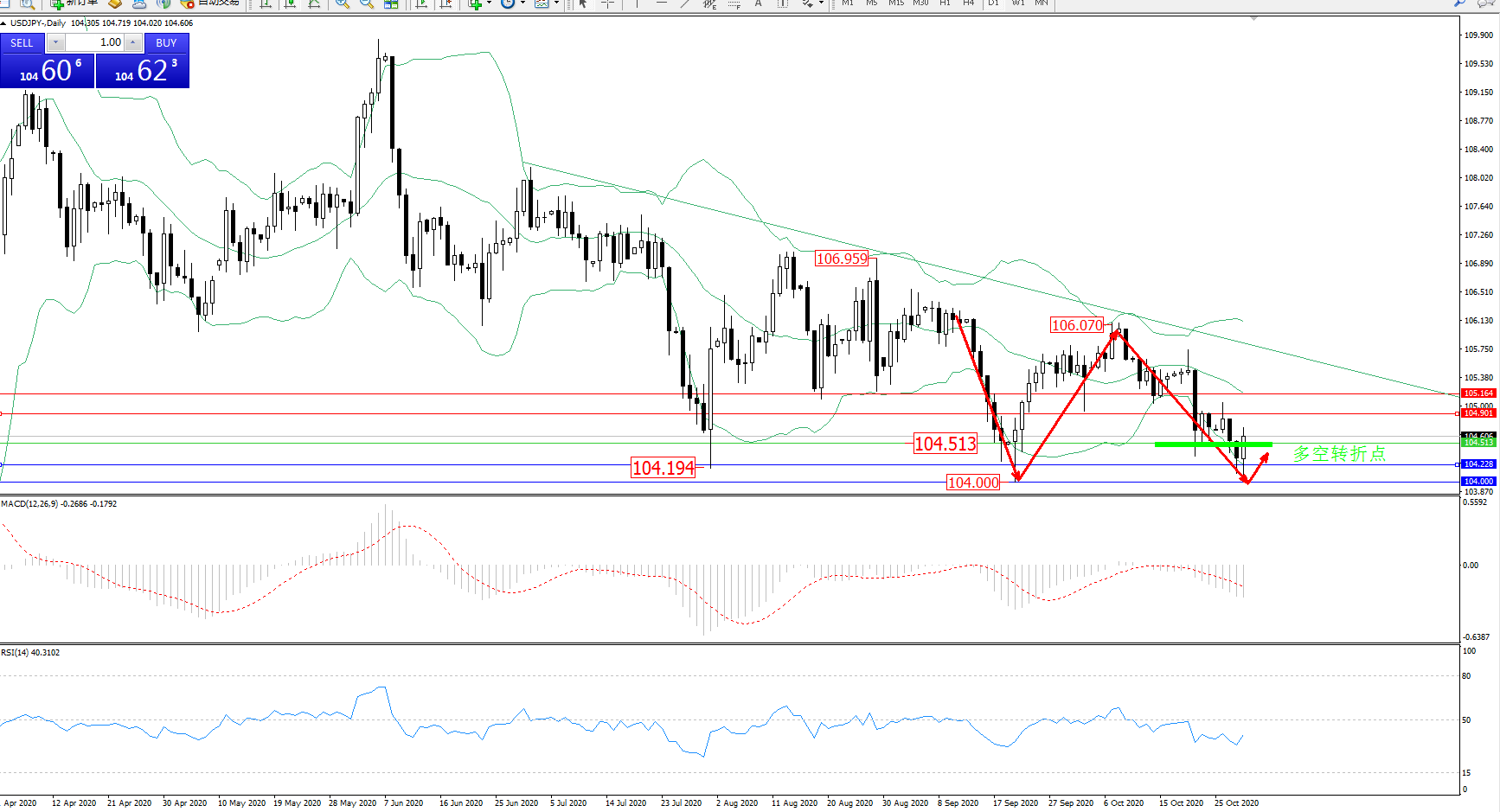 备选策略:104.513下方看跌,目标104.228、104.000