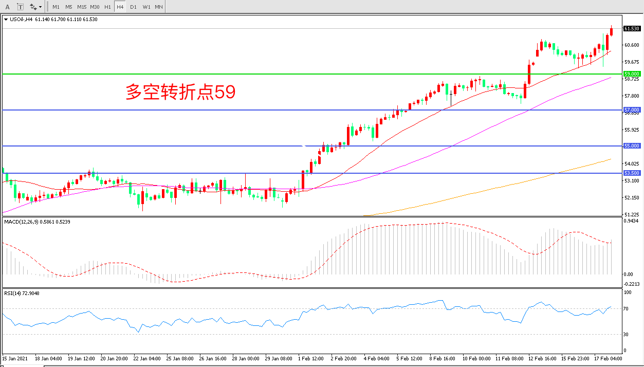 周四(2月18日)凌晨,根据美国石油协会公布的数据显示,当周API原油库存大幅减少580万桶,好于市场预期减,数据公布后,美油短线攀升,收报61.72美元/桶,涨幅扩大至2.78%。受假期因素影响,EIA数据将于周五凌晨0:00公布,如果该数据与API表现一致,无异于火上浇油,油价将迎来更大幅度的上涨。