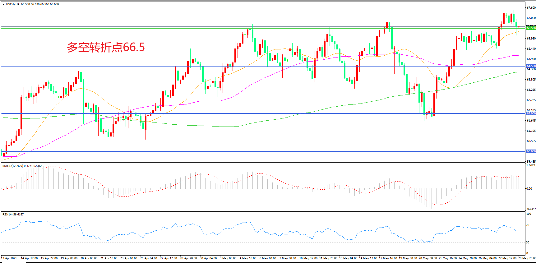 4小时图看,油价强势突破前期整理区间,整体表现十分强势,69美元成为中期阻力,66.5成为下方支撑,MACD红柱增加,RSI指标向上,日内震荡上行概率较大。