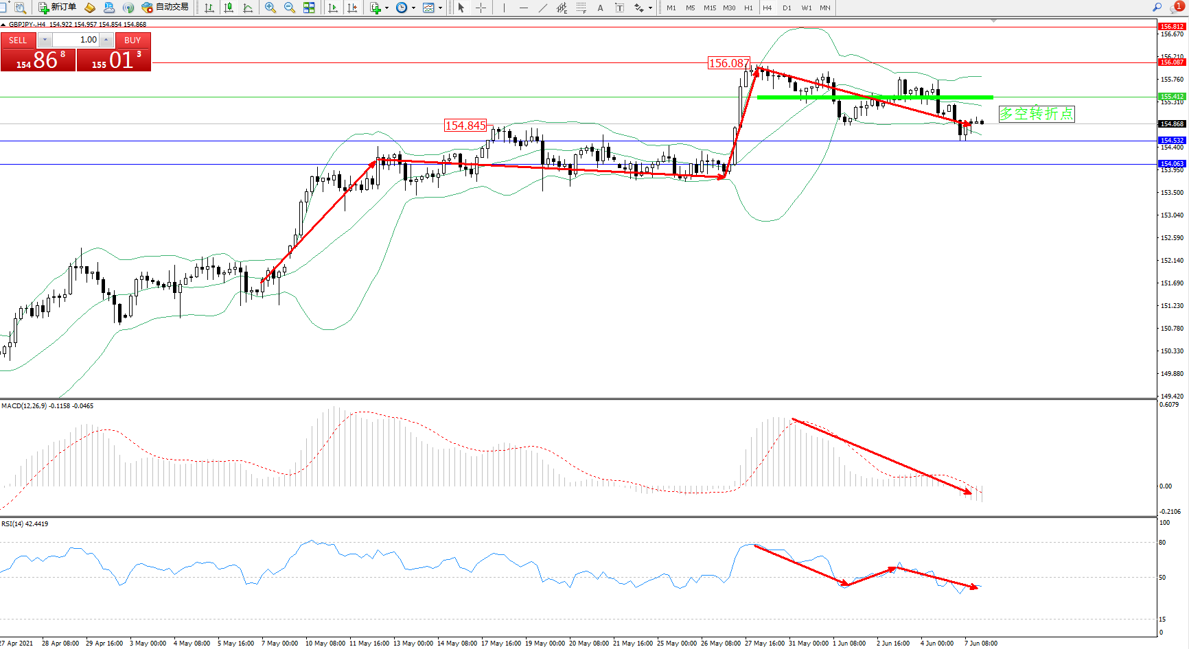 交易策略:155.412下方看跌,目标154.532、154.063