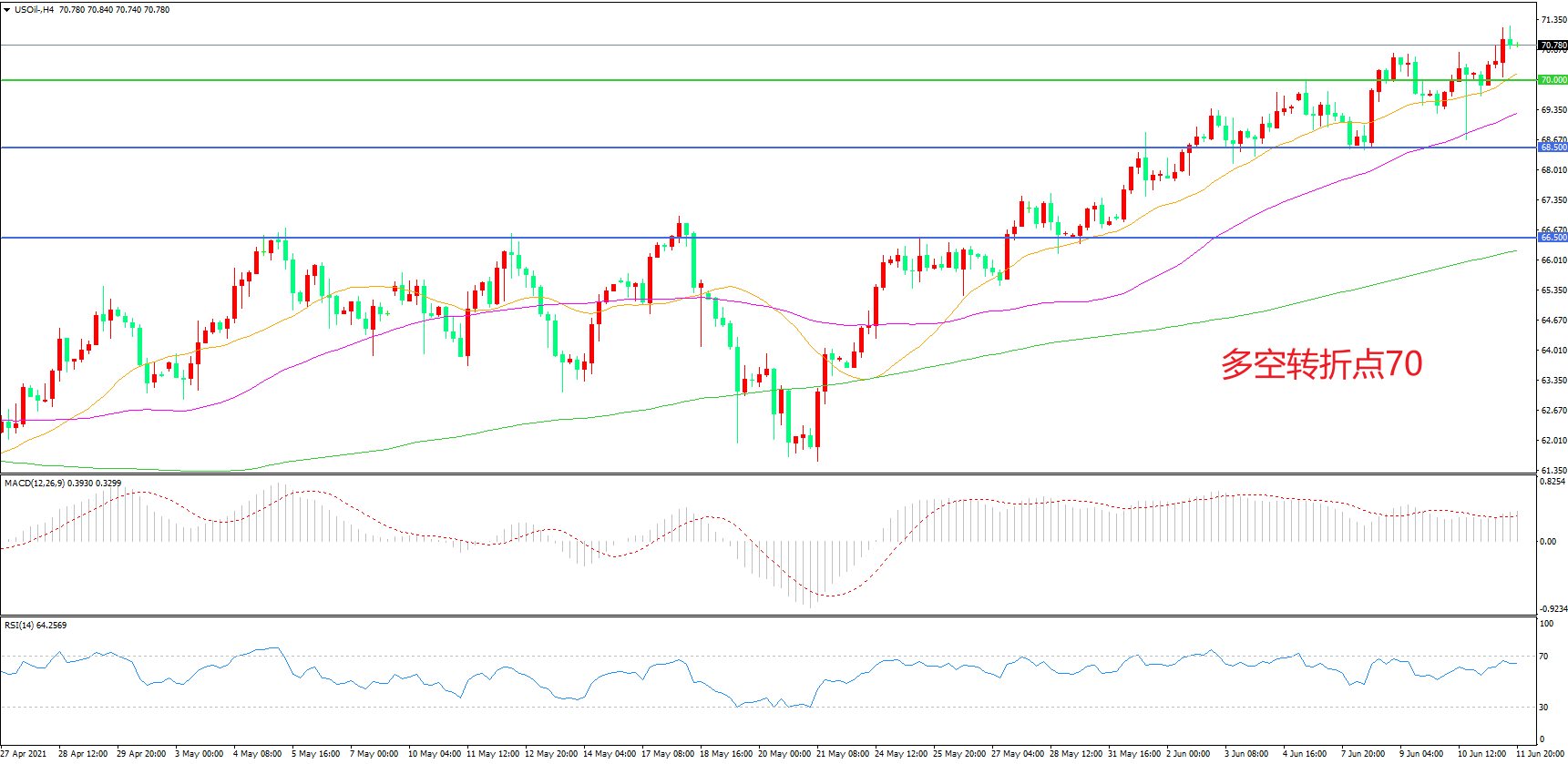 4小时图看,油价延续冲高态势,整体表现较强,70美元成为短期多空分水岭,MACD红柱增加,均线系统呈多头排列,日内延续上行概率较大。
