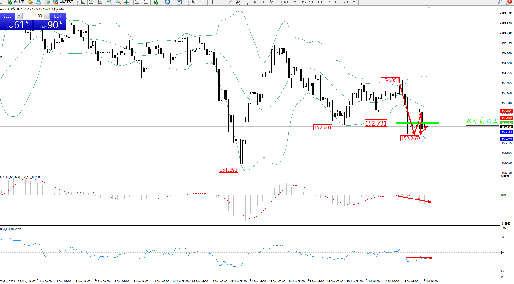 交易策略:152.731下方看跌,目标152.443、152.229