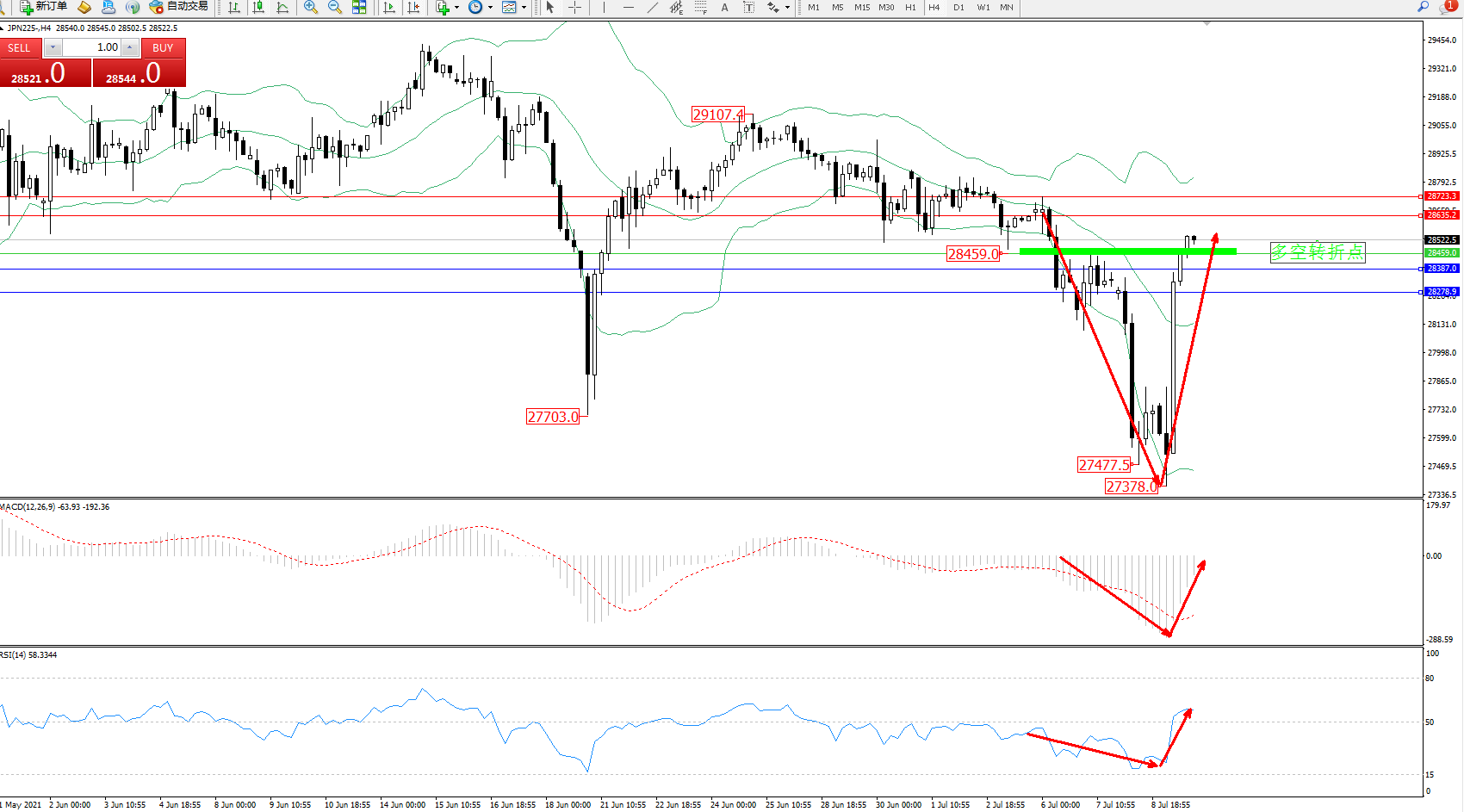 日经指数JPN225——4小时K线图显示: