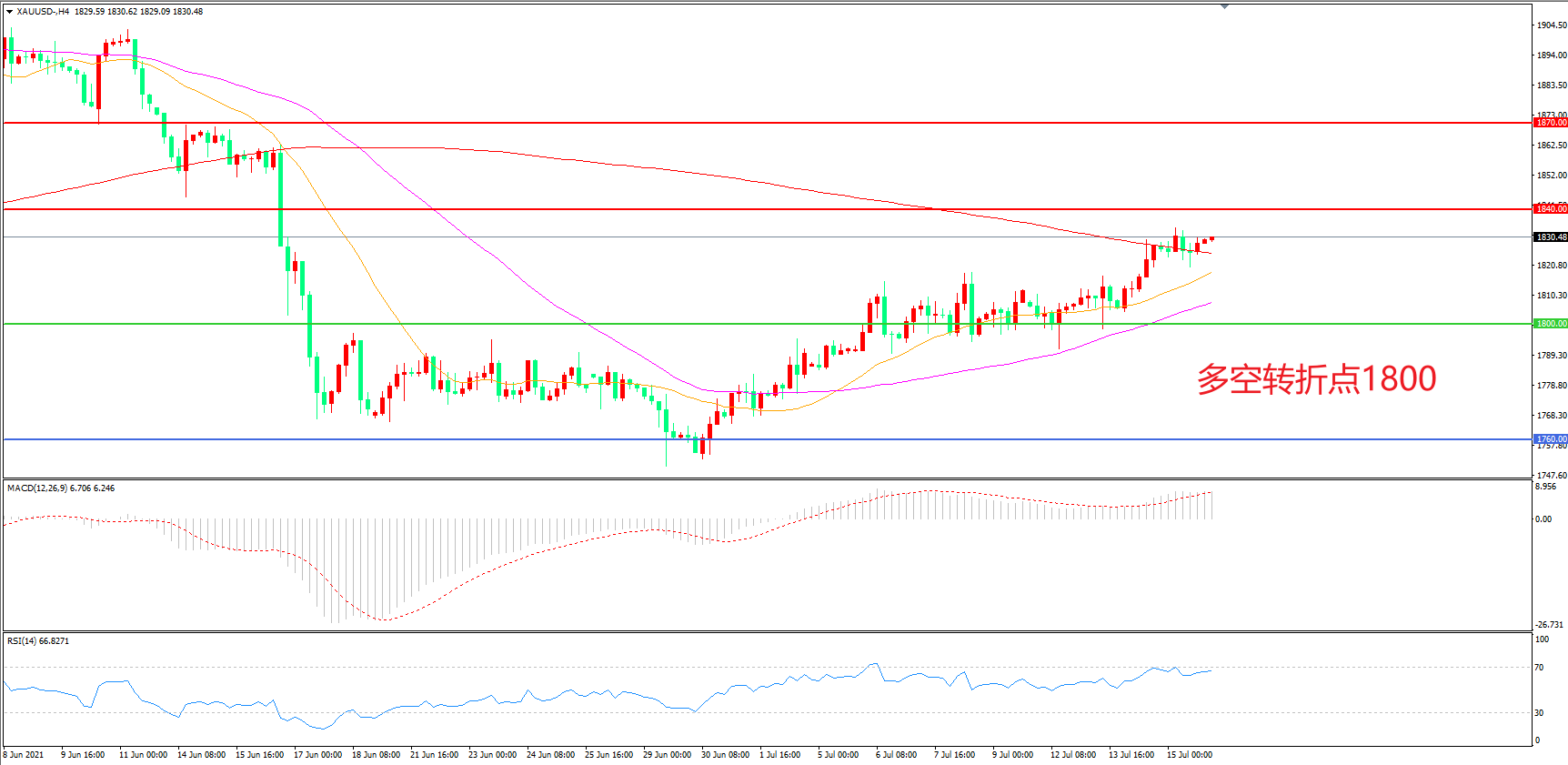 交易策略:  在1800.00之上看涨,目标1840.00        1870.00