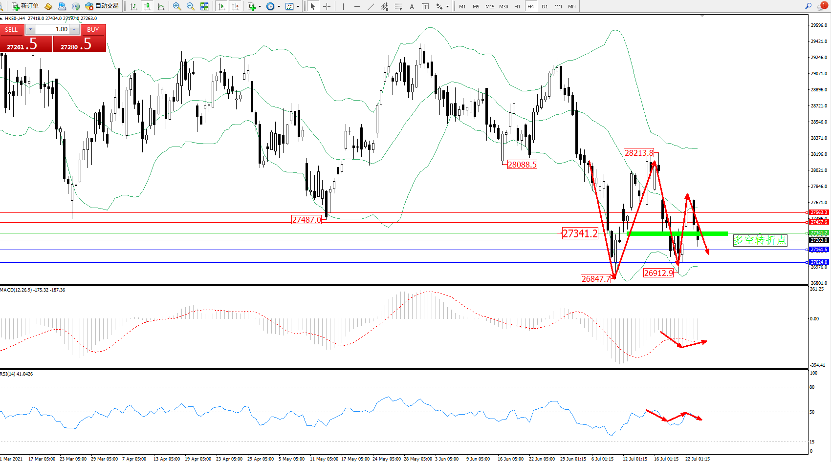 恒指HK50 ——4小时K线图显示: