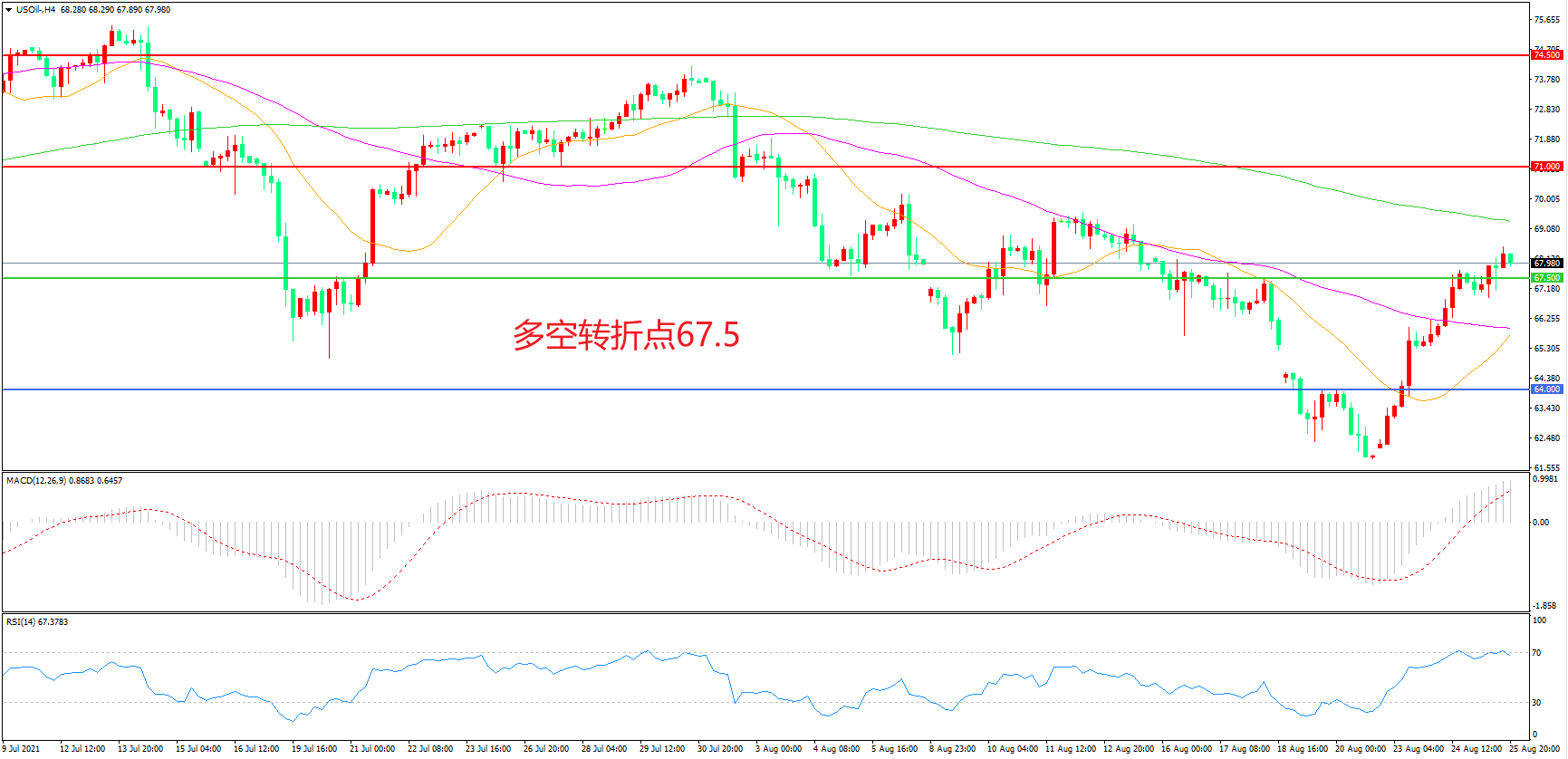 交易策略:在67.50之上看涨,目标71.00 74.50