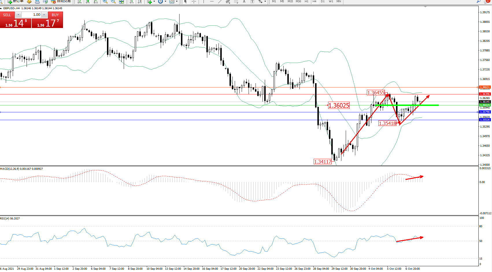 交易策略:1.36025上方看涨,目标1.36396、1.36631