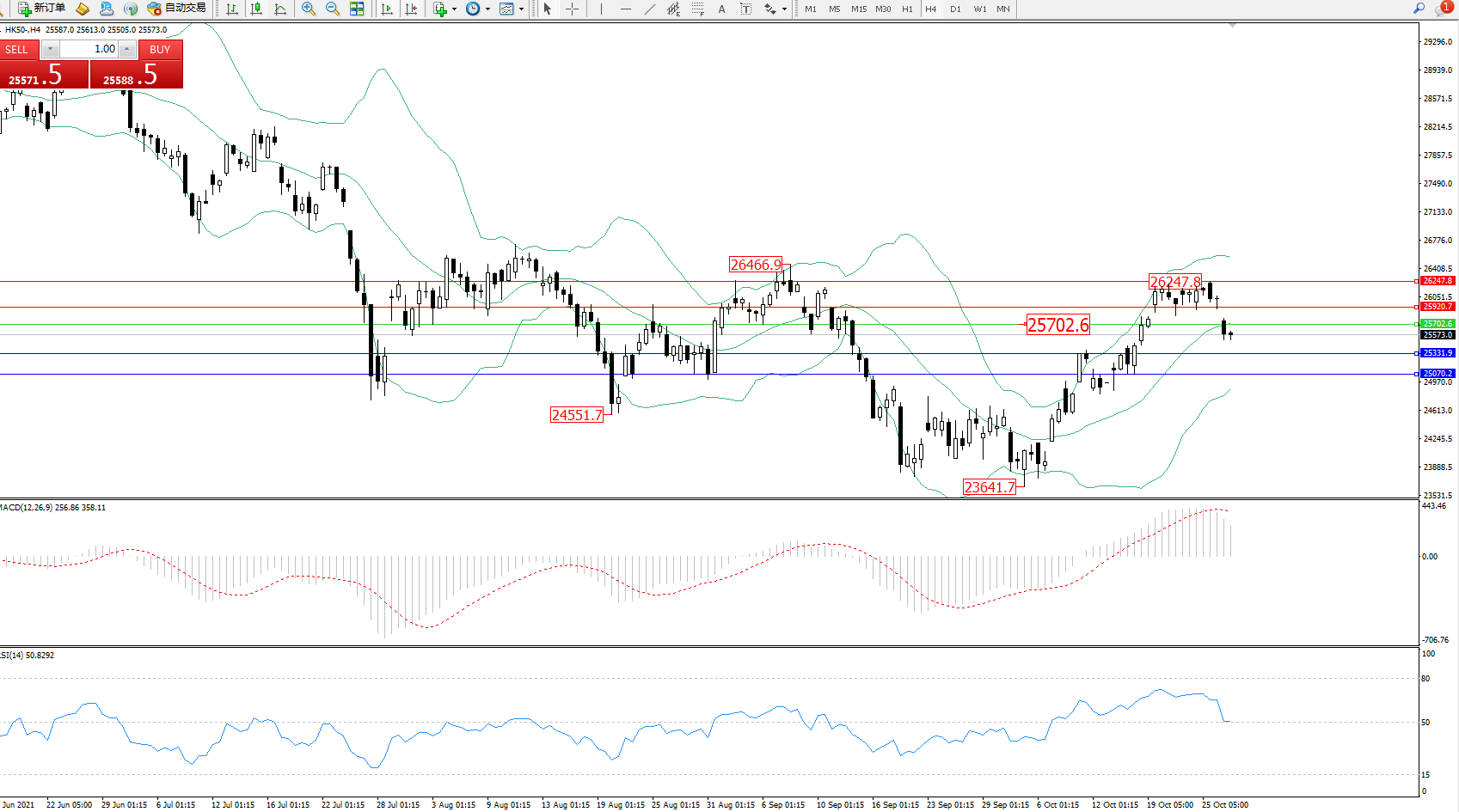 香港恒生指数10月27日(周三)收盘下跌409.53点,跌幅1.57%,报25628.74点;港股三大指数集体大跌,权重科技股下挫使大市再度承压,致恒生科技指数跌3.19%报6441点,大型科技股美团跌5%,百度、京东跌近4%,阿里巴巴、腾讯跌近3%;金融股、汽车等热门板块集体下跌,海底捞跌超7%再创调整新低,且市值跌破1300亿港元大关。恒大概念股少数上涨。创维集团暴涨超59%,前三季光伏业务收入大增27275%。今日大市成交额为1206亿港元,南下资金净流出5.11亿港元。