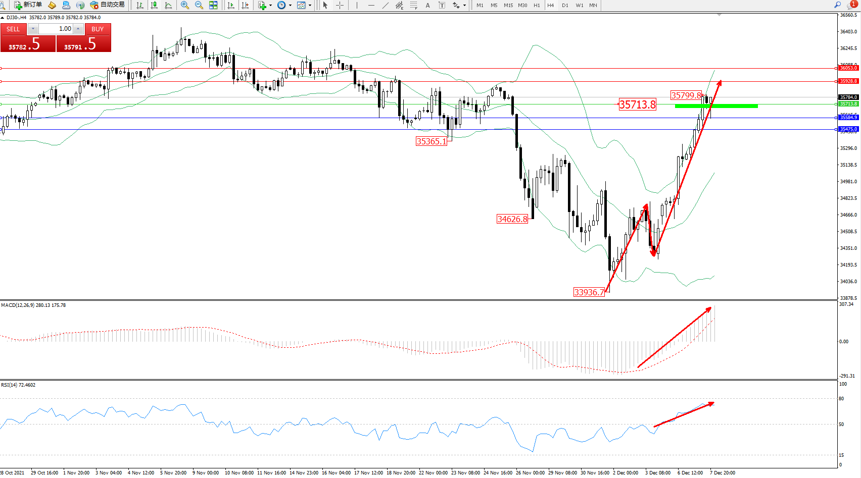 道琼斯指数DJ30——4小时K线图显示: