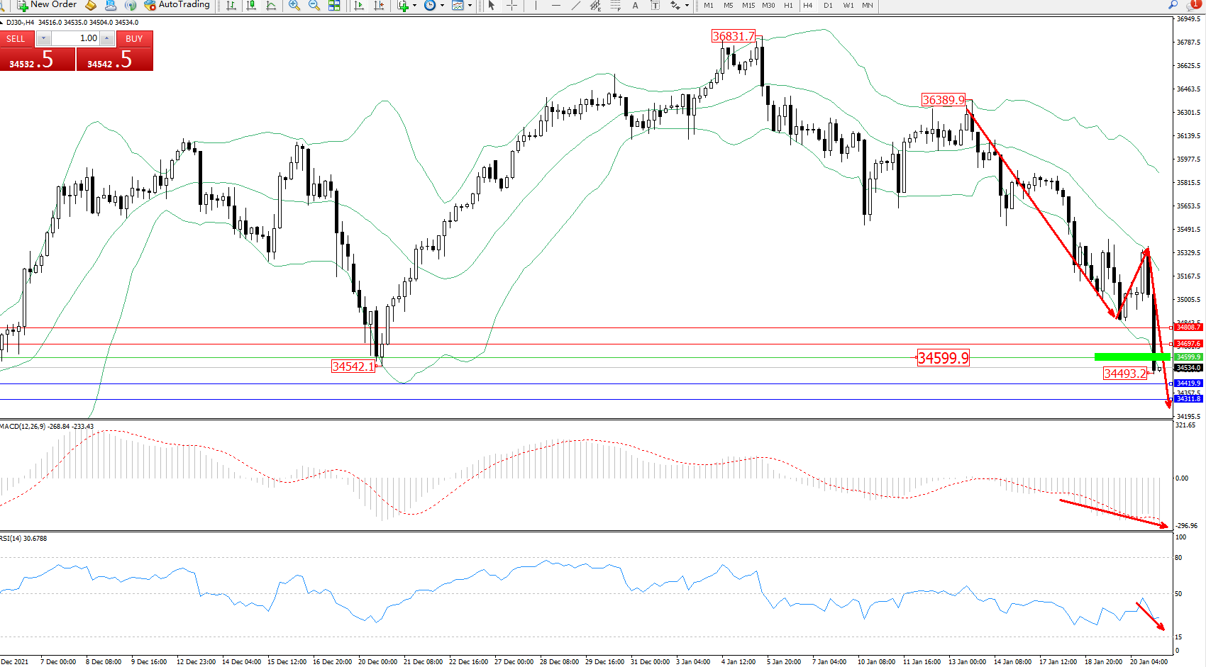 道琼斯指数DJ30——4小时K线图显示: