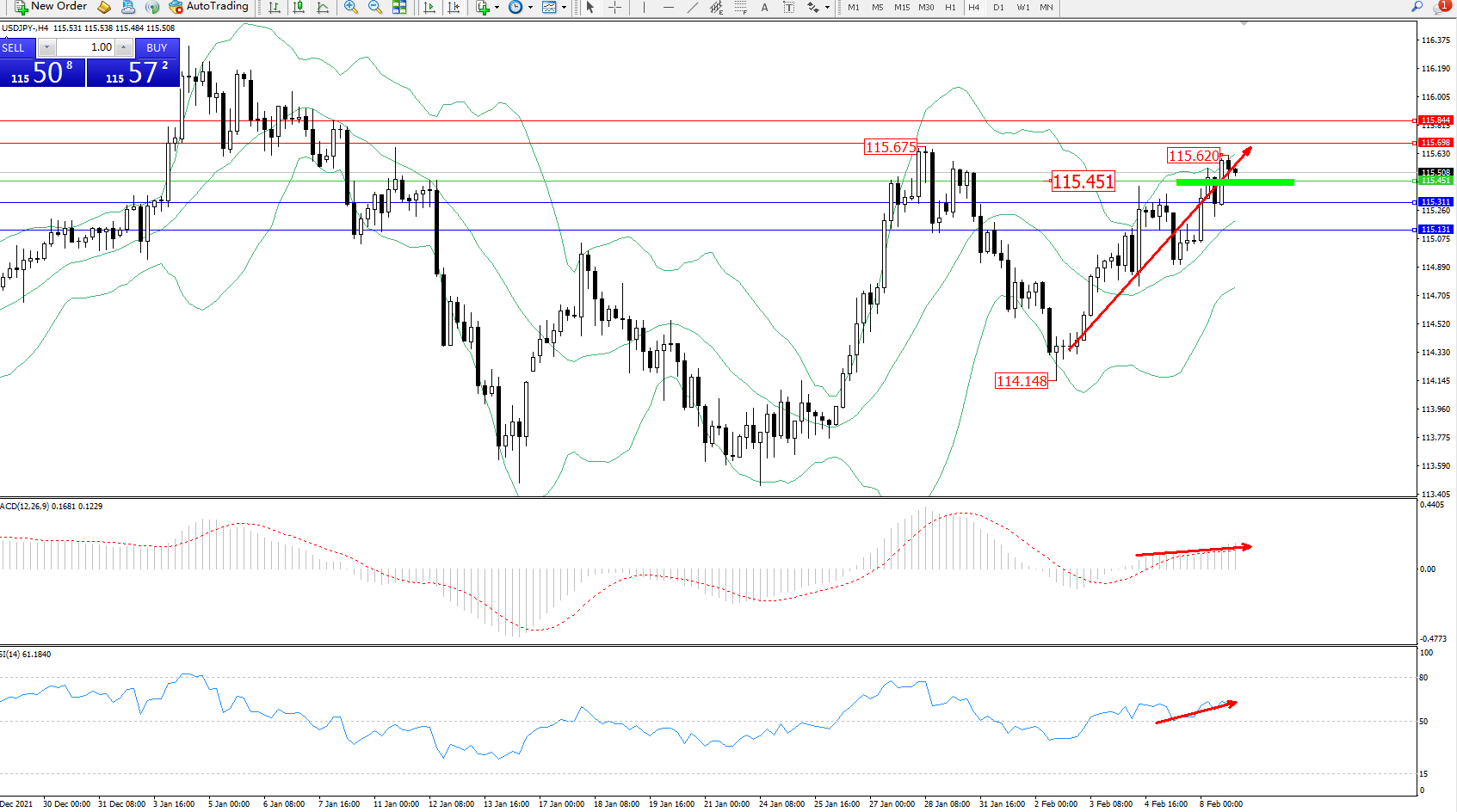 交易策略:115.451上方看涨,目标115.698、115.844