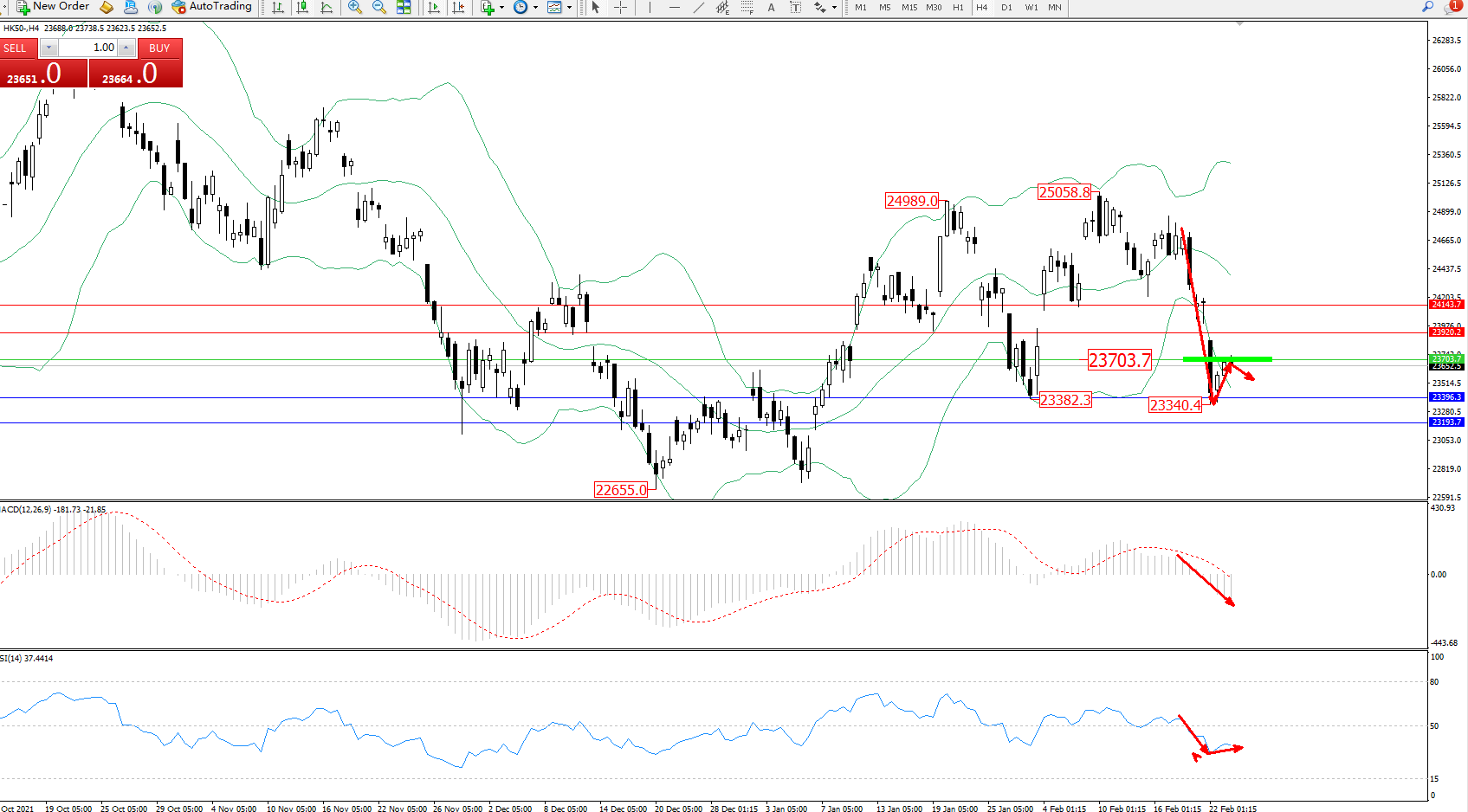 恒指HK50 ——4小时K线图显示: