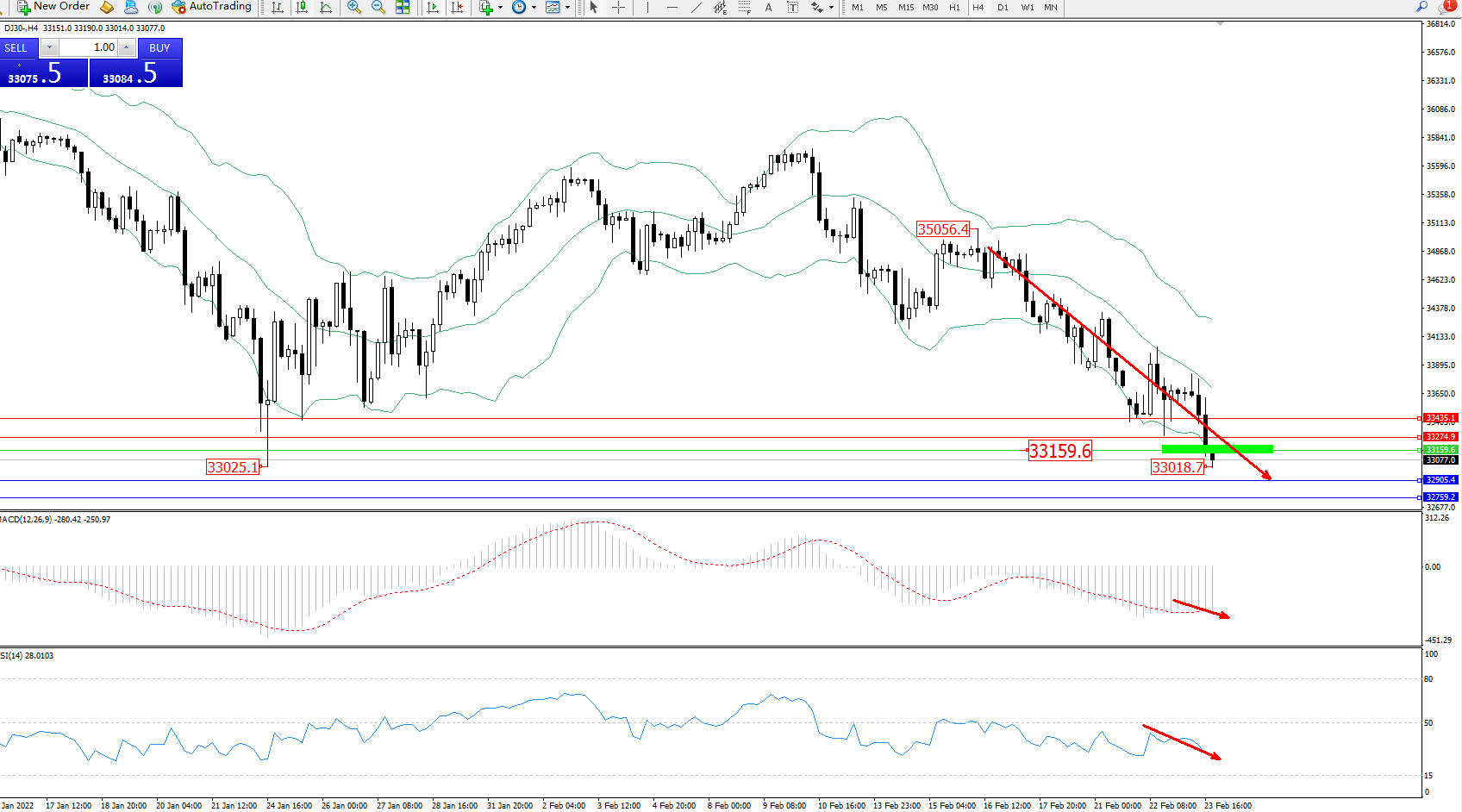 技术点评:空头动力延续布林带指标通道中下轨区间持续震荡下行,低位抵达33018位置后开始震荡,短期跌势有继续下行态势,且未见有止步迹象,布林带指标呈向下移动态势良好,MACD指标处于空头区域维持整理平移,RSI指标处于空头区域维持弱势整理徘徊向下移动中;