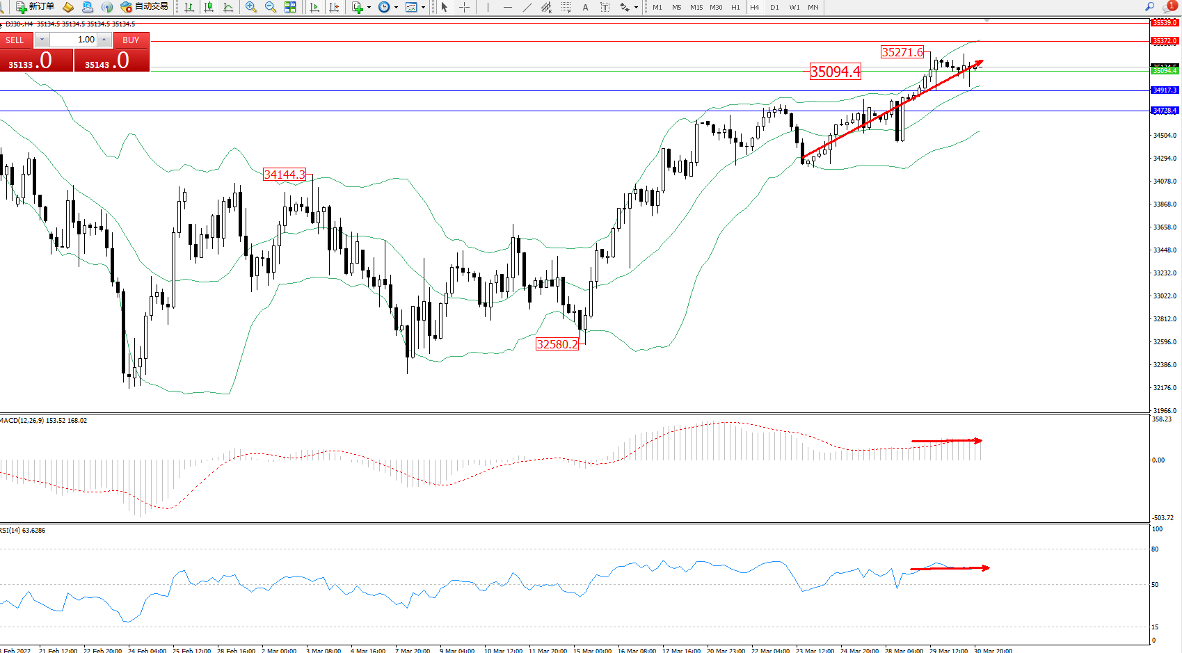 技术点评:多头动力延续布林带指标通道中上轨区间持续震荡上扬,高位抵达35271位置节点后开始整理平移,布林带指标呈上行趋势走势态势良好,短期向上移动趋势或将持续,MACD指标处于多头区域维持整理平移中,RSI指标处于多头区域维持弱势徘徊;