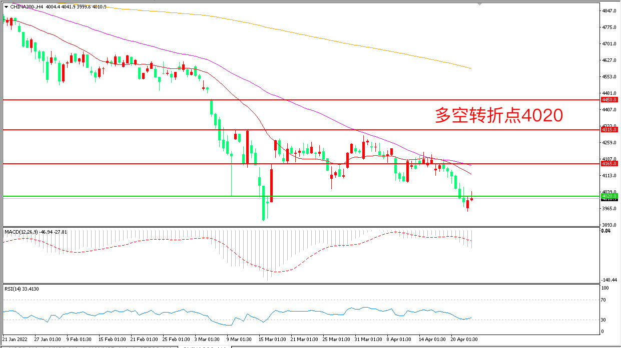 4小时图看,沪深300连续下破后小幅反弹,短线有止跌迹象,均线系统成为上方阻力,4020成为多空分水岭,MACD绿柱增加,RSI指标走平,日内冲高回落概率较大。