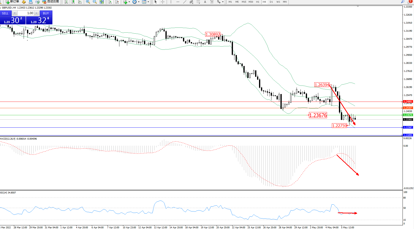 交易策略:1.23676下方看跌,目标1.22587、1.21895