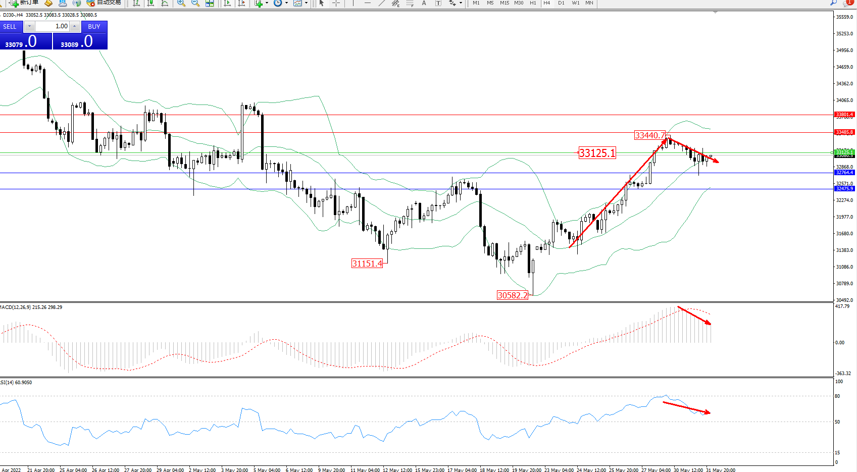 技术点评:多头动力延续布林带指标通道中上轨区间持续震荡上扬,高位抵达33440附近节点后回撤整理,布林带指标呈收口走势持续中,MACD指标处于多头区域Wichita整理缓慢回撤,RSI指标处于多头区域维持震荡不断下移中;