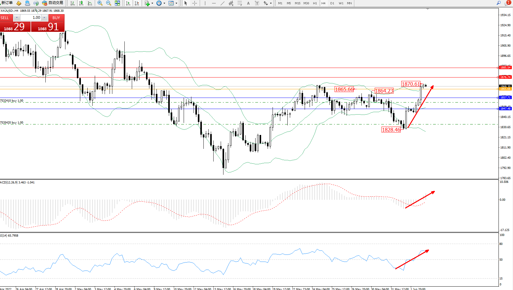 黄金XAUUSD——4小时K线图显示: