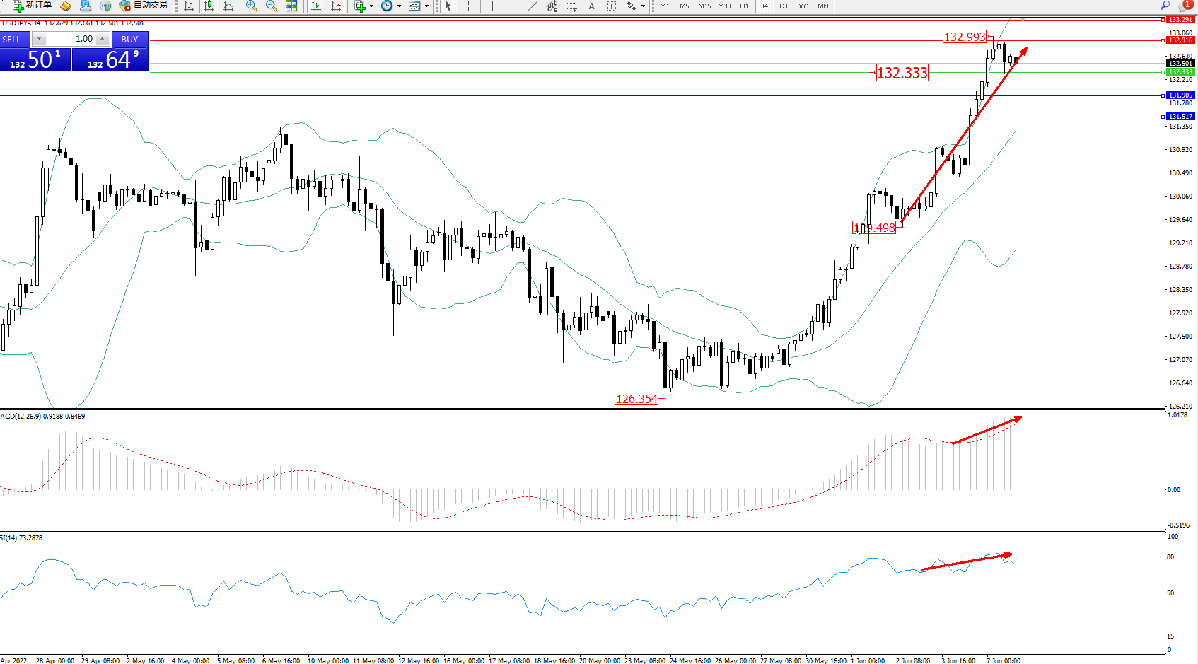 交易策略:132.333上方看涨,目标132.916、133.291