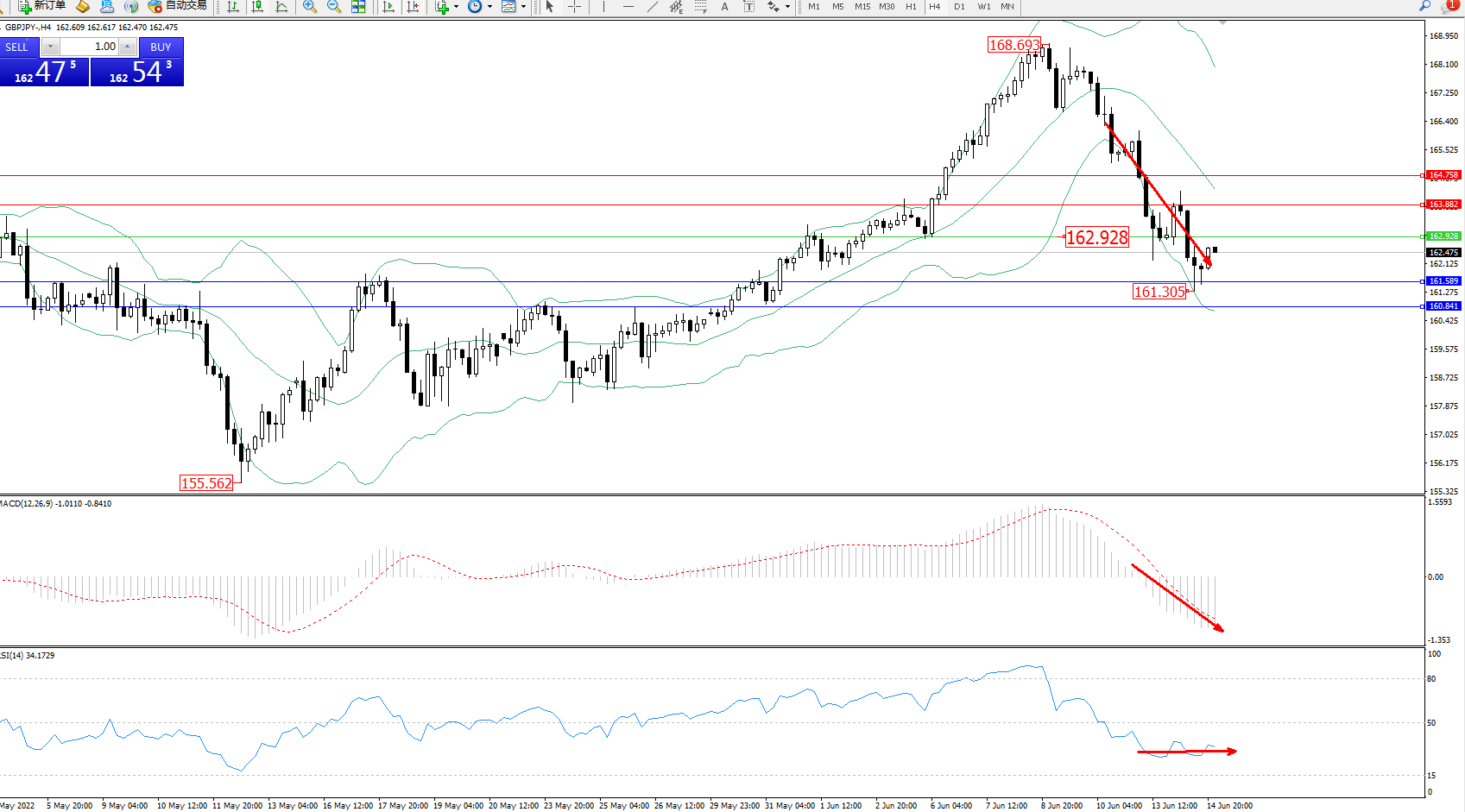 交易策略:162.928下方看跌,目标161.589、160.841