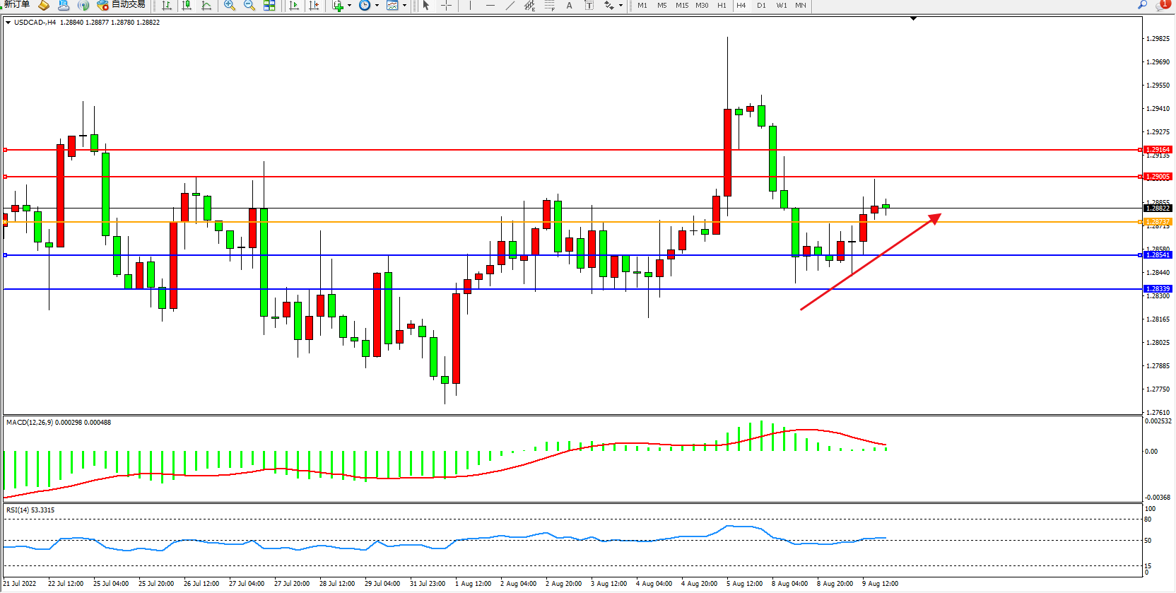 美元加元USDCAD——4小时K线图显示: