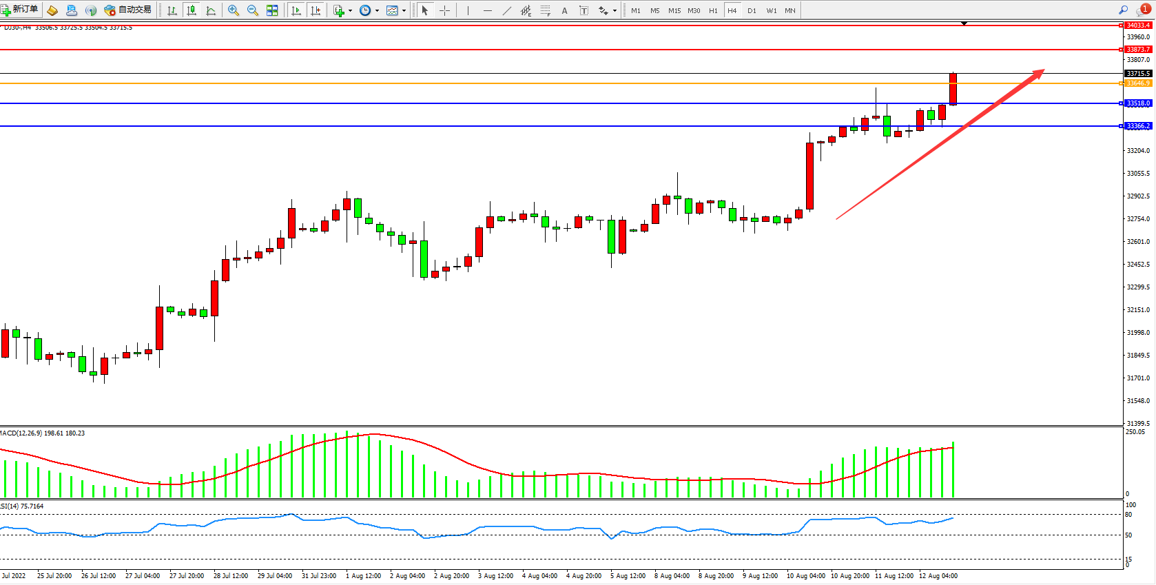 道琼斯指数DJ30——4小时K线图显示: