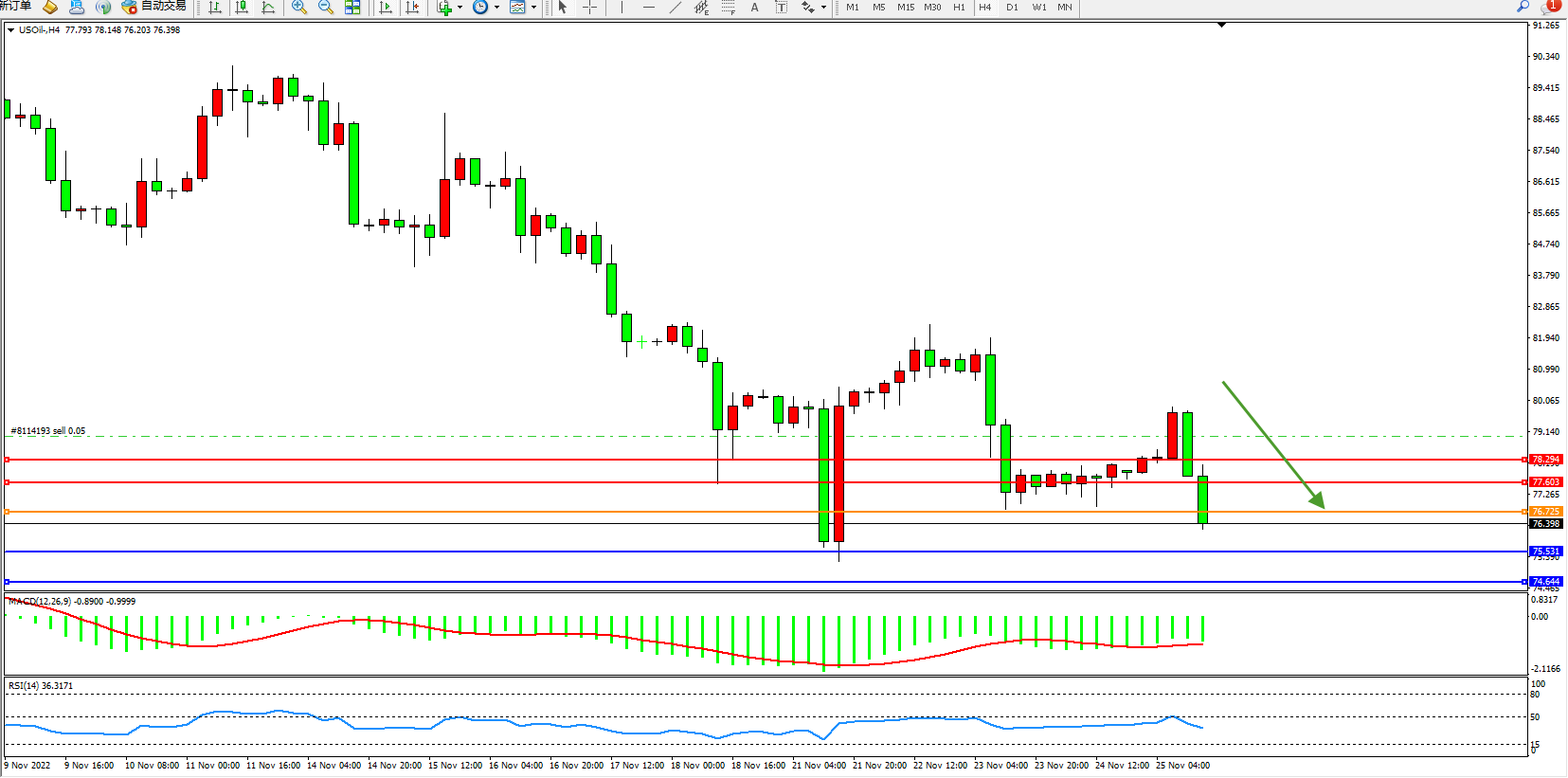 交易策略:76.725下方看跌,目标75.531、74.644