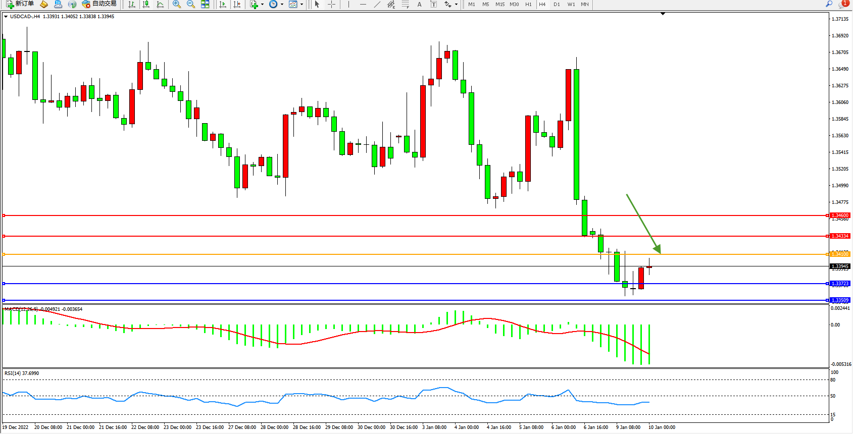 美元加元USDCAD——4小时K线图显示: