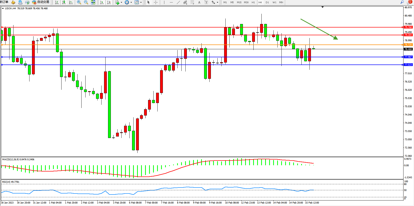 交易策略:78.720下方看跌,目标77.987、77.523